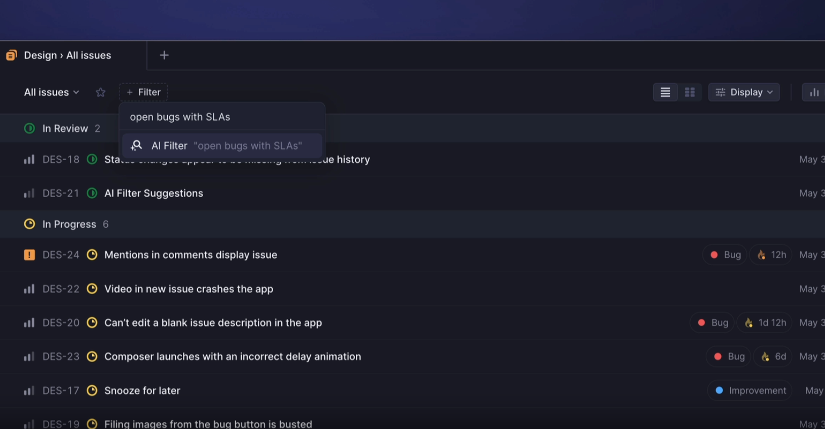 The second example is coincidentally also about filtering but comes from Linear. In their own words, "describe the issues or projects you want to see in a few words, and the corresponding filters will be applied using AI."